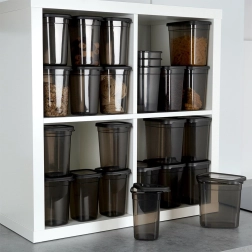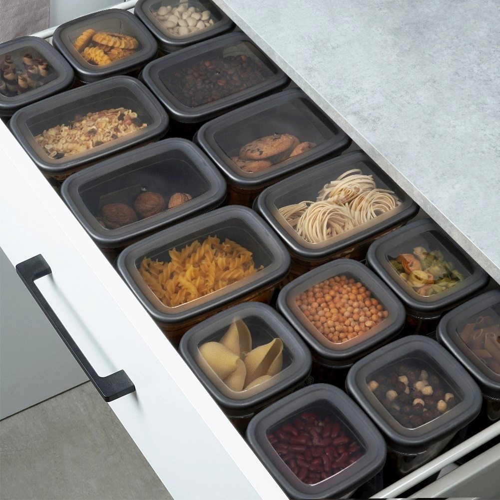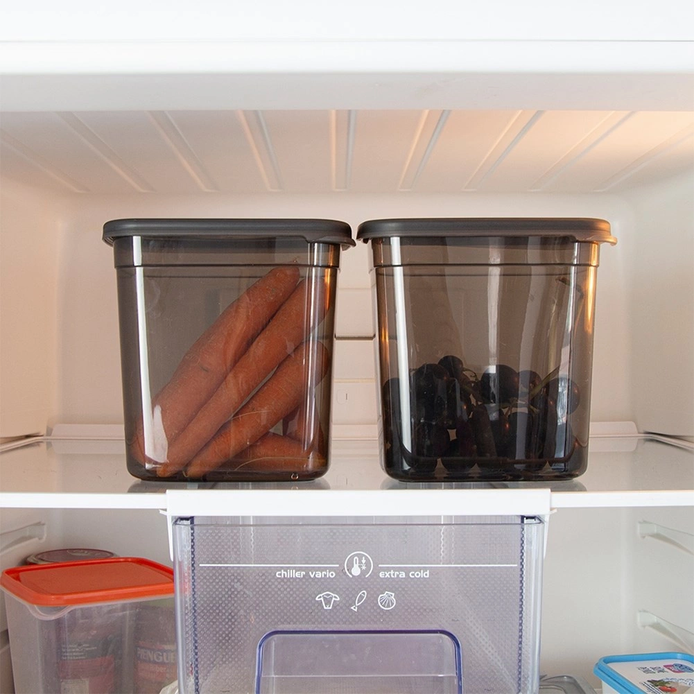 Le profil rectangulaire et le couvercle plat facilitent l’empilage de plusieurs récipients et l’utilisation efficace de l’espace dans le garde-manger, les tiroirs et le réfrigérateur.