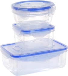 Les couvercles avec quatre clips d’encliquetage offrent une protection anti-fuite totale, idéal pour les trajets, le travail et l’école. Les boîtes sont empilables et emboîtables, économisant de la place dans le placard, le réfrigérateur et le congélateur. Compatibles lave-vaisselle et micro-ondes (couvercle avec valve de ventilation).