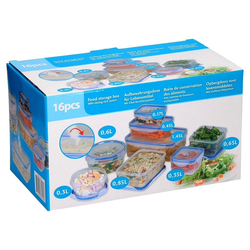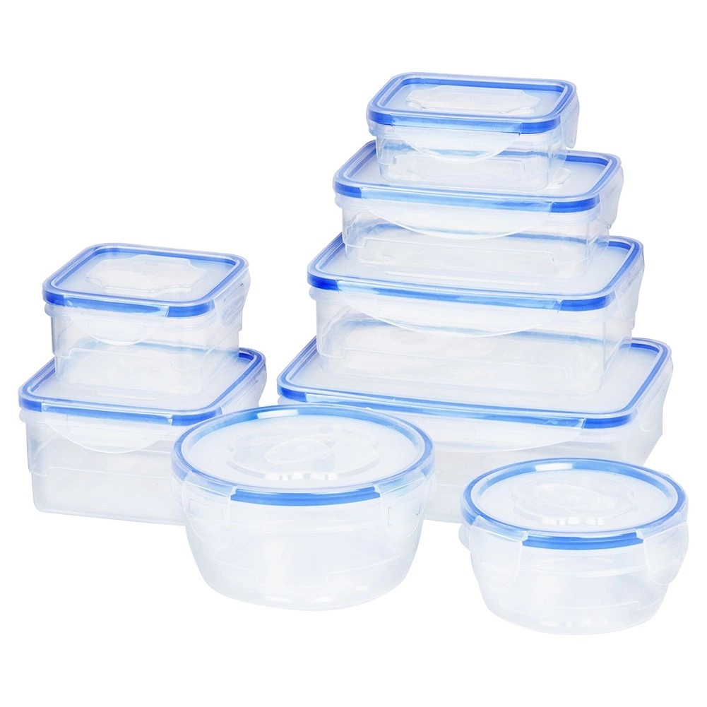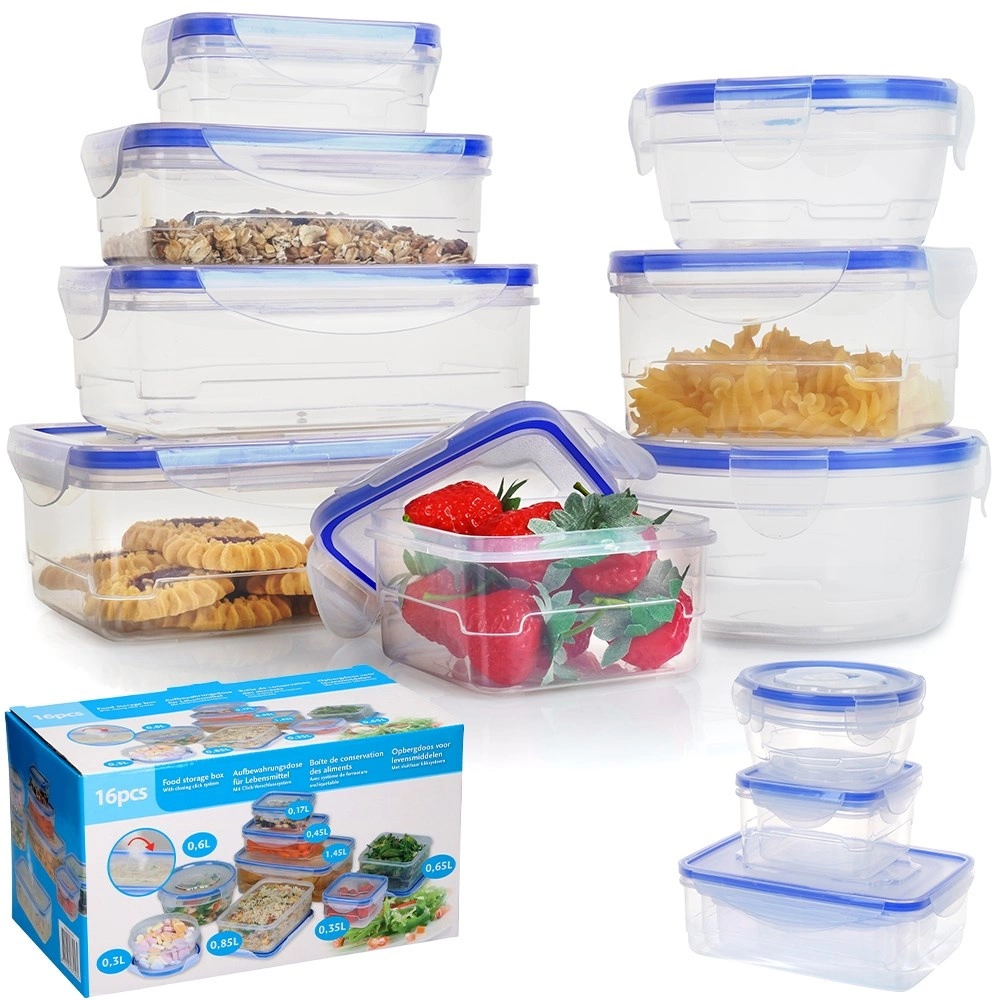 Pratique ensemble de 8 boîtes alimentaires hermétiques avec joint en silicone bleu et quatre clips de verrouillage. Sans BPA, résistantes, hermétiques et anti-fuites, compatibles lave-vaisselle, micro-ondes et congélateur. Formes et tailles variées pour un rangement clair des pâtes, biscuits, salades, fruits et restes de repas.