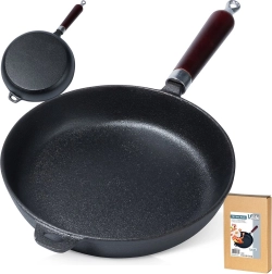 La poêle convient à tous les types de tables de cuisson – gaz, électricité, vitrocéramique, halogène et induction. Elle peut également être utilisée sur flamme directe et, après dévissage du manche, au four. Idéale pour la cuisine, le camping et le barbecue. Pour une longue durée de vie, nous recommandons un entretien régulier : après lavage, bien sécher puis huiler légèrement (non compatible lave-vaisselle).