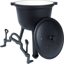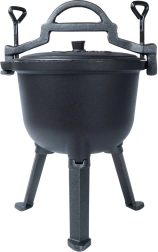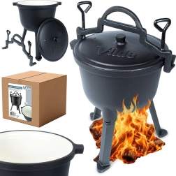 Le couvercle est doté d’un orifice d’aération et de deux vis de serrage pour une fermeture fiable. Le chaudron possède une anse supérieure de transport et deux poignées latérales auxiliaires pour une manipulation aisée. La surface émaillée facilite l’entretien et réduit l’adhérence.