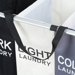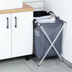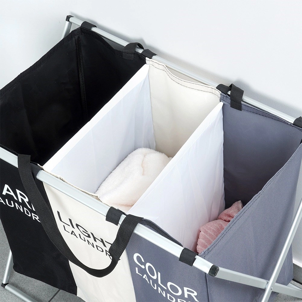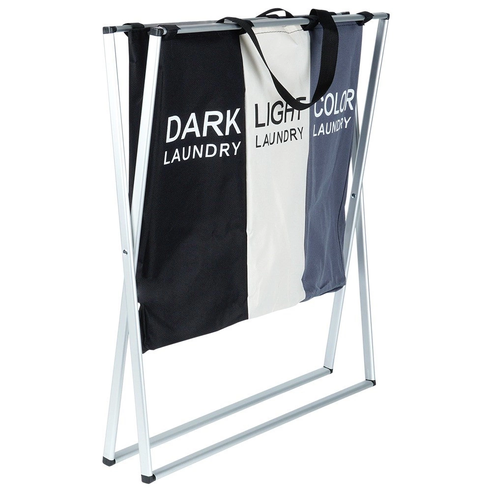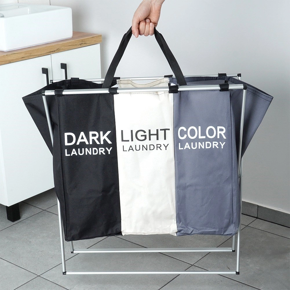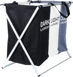 Gardez votre linge organisé avec un panier à trois compartiments qui permet un tri immédiat entre foncé, clair et coloré. Léger mais stable, le cadre métallique argenté et les sacs textiles robustes assurent une longue durée de vie et un usage quotidien confortable.