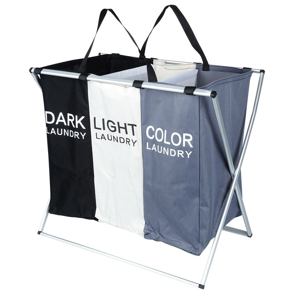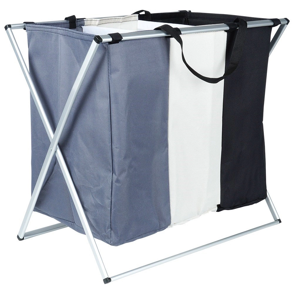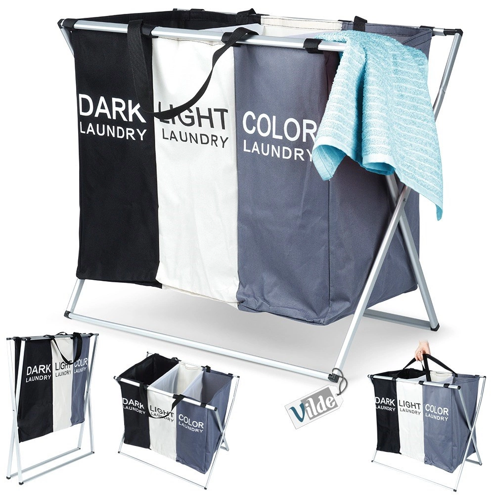 Pratique panier à linge à trois compartiments d’un volume de 105 l qui facilite le tri quotidien en dark / light / color. Grâce à sa structure métallique robuste et à son tissu polyester résistant, il garde sa forme, est stable, pliable et doté de poignées pour un transport aisé – idéal pour la salle de bain comme pour la buanderie.