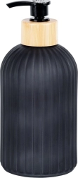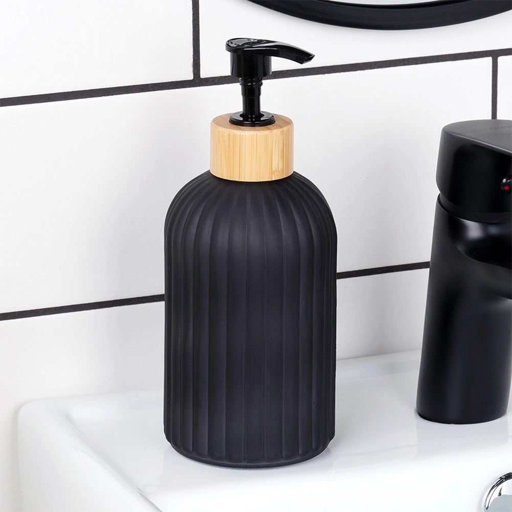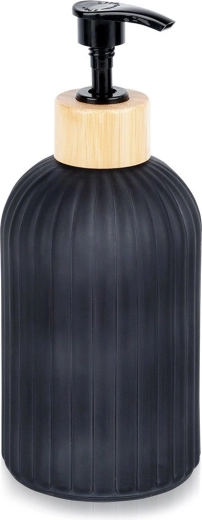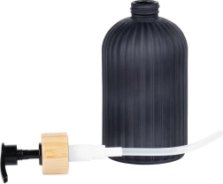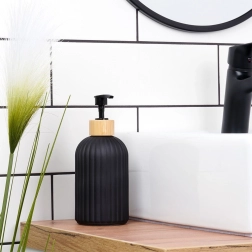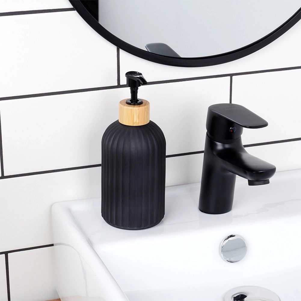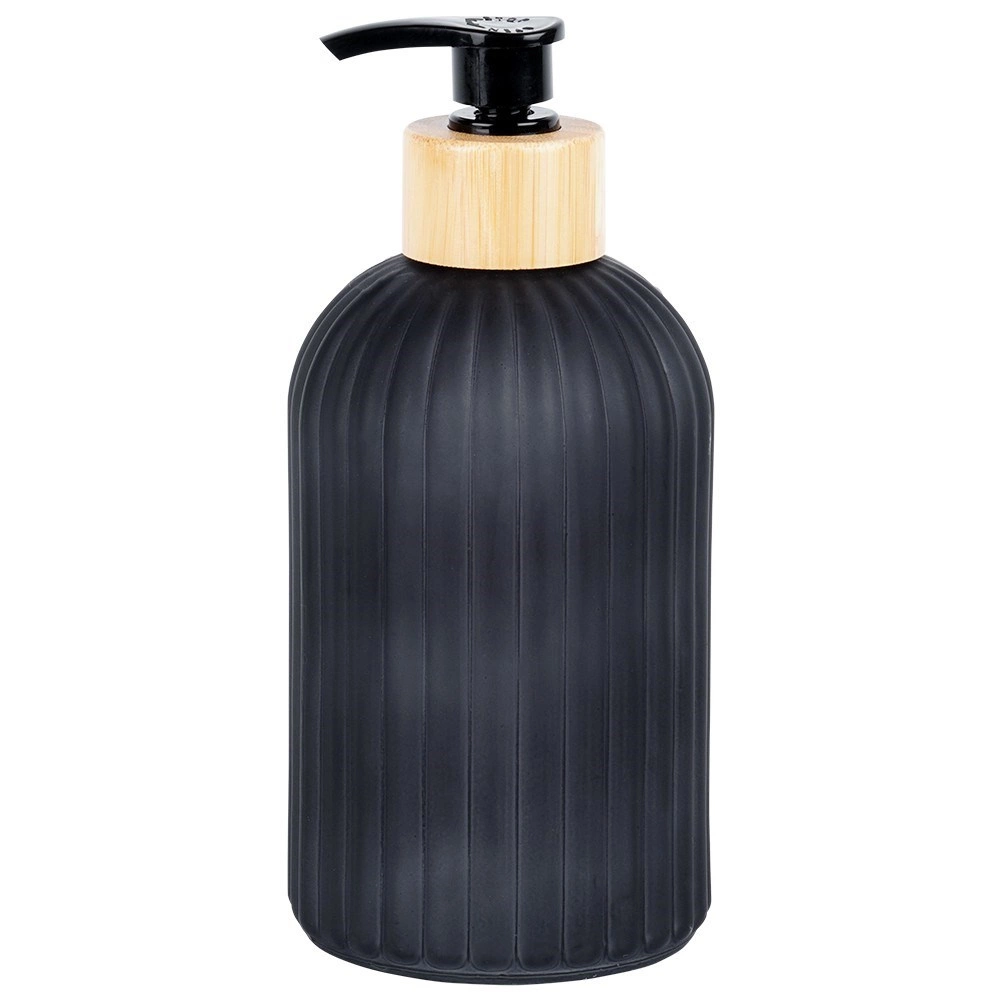 Ce distributeur stylé pour savon liquide ou liquide vaisselle associe un verre résistant à une finition noire mate et un accent en bambou naturel. Les rainures verticales apportent une touche moderne tout en améliorant la prise en main. Il convient à la salle de bain comme à la cuisine et s’intègre facilement dans les intérieurs contemporains grâce à ses lignes épurées.