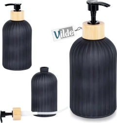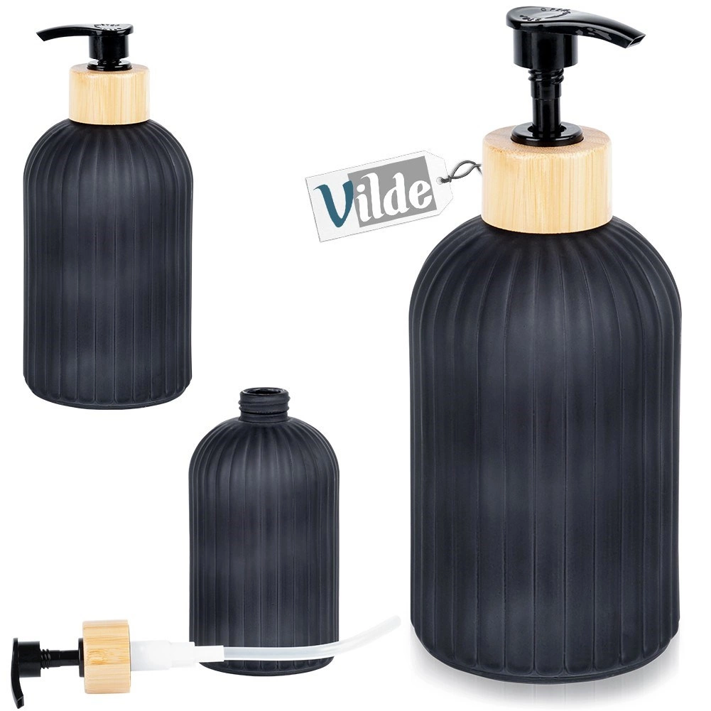 Élégant distributeur de savon en verre de 400 ml en finition noire mate, avec anneau en bambou naturel et pompe noire. Grâce à sa texture antidérapante rainurée, il tient bien en main, se remplit facilement et, avec son design minimaliste moderne, il embellit aussi bien la salle de bain que la cuisine. La pompe pratique verrouillable facilite le transport et empêche les fuites de liquide.