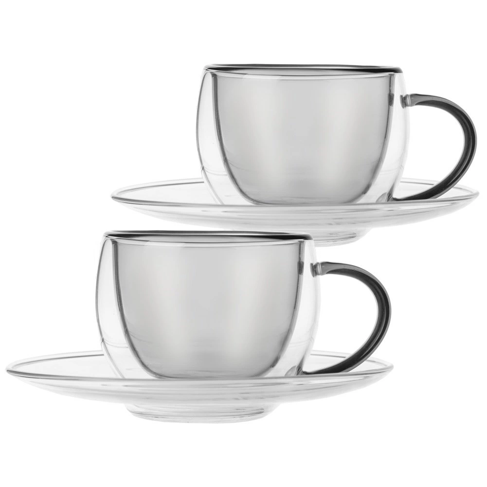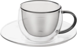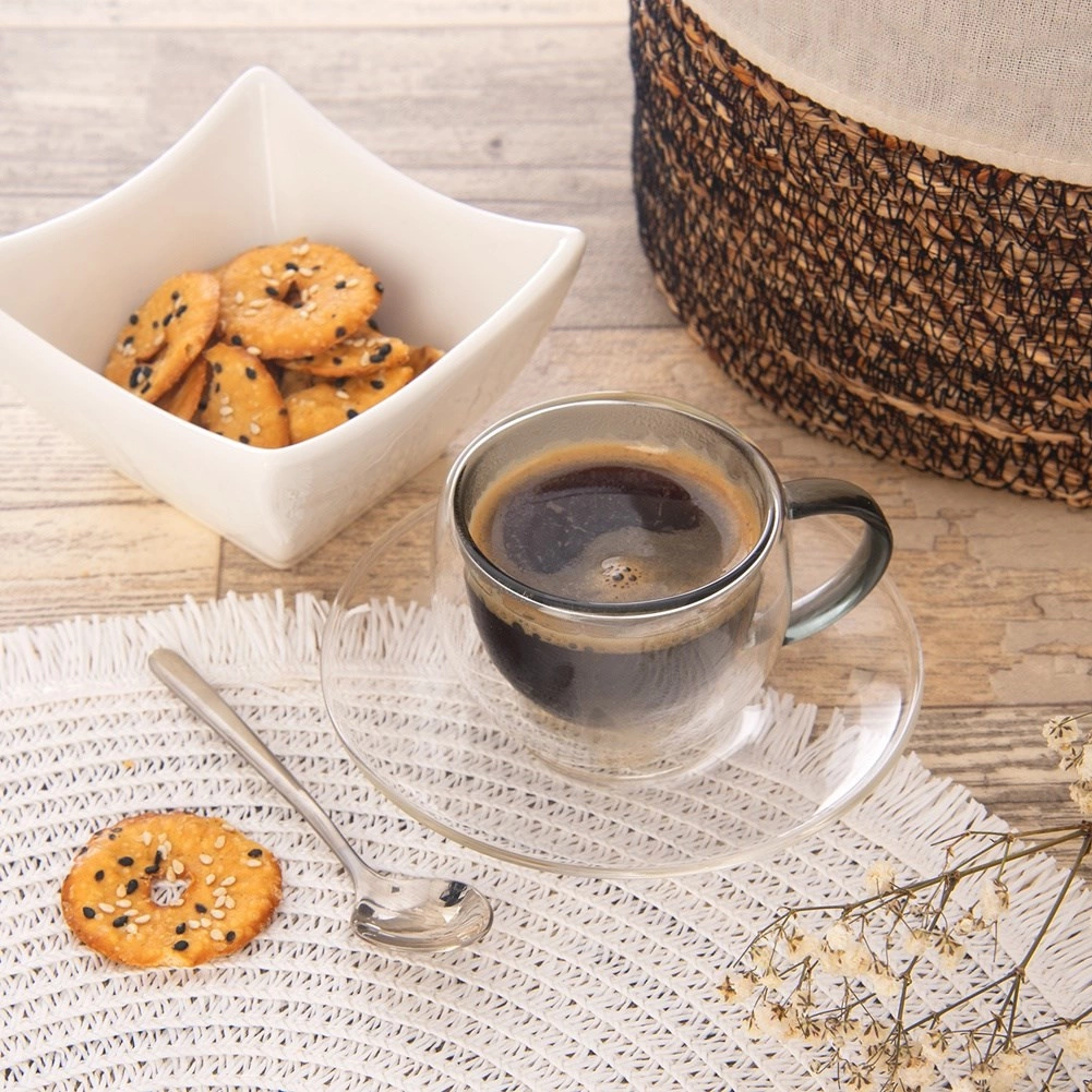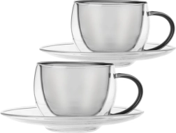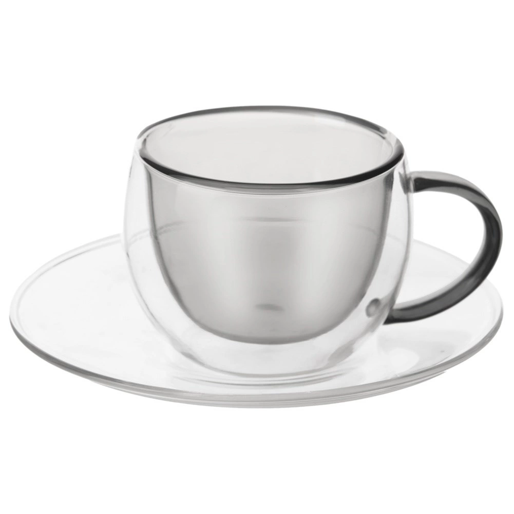 Découvrez des tasses thermo au style moderne alliant design et fonctionnalité. La double paroi en verre borosilicate assure une isolation thermique efficace pour le chaud comme pour le froid : les boissons chaudes ne brûlent pas la main et les boissons froides restent fraîches plus longtemps. Chaque tasse a une capacité de 90 ml, des dimensions de 9 × 6,5 × 5,5 cm et est complétée par une soucoupe parfaitement ajustée de 12 cm de diamètre.