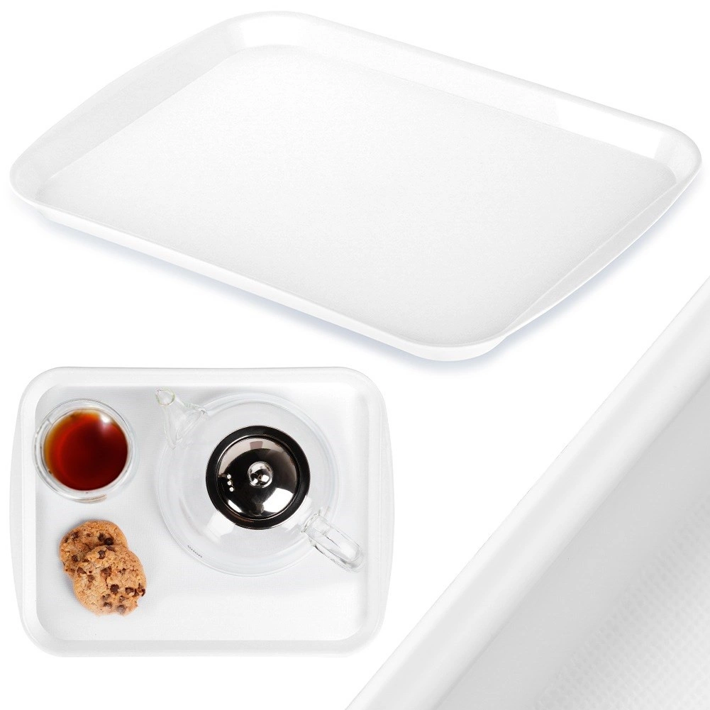 Pratique plateau de service blanc en plastique résistant, dimensions 35,5 × 27 × 2,5 cm, pour un usage quotidien à la maison comme en restauration. Grâce à sa surface antidérapante et à son bord haut, vous transportez boissons, desserts et petits-déjeuners en toute sécurité. Le plateau est léger, facile à nettoyer et compatible lave-vaisselle.