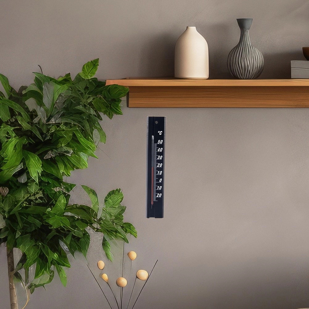Thermomètre mural universel au design noir élégant, adapté à tous les intérieurs et extérieurs protégés. L’échelle claire en degrés Celsius permet une lecture rapide et précise de la température, que ce soit au salon, dans la cuisine, sur le balcon ou au jardin.