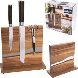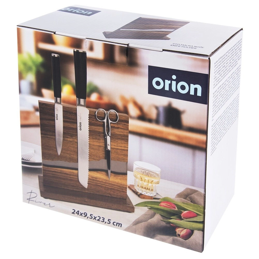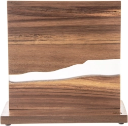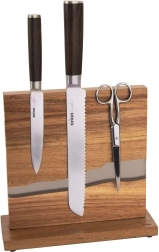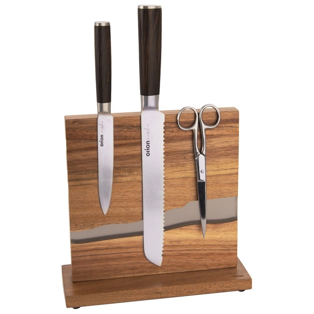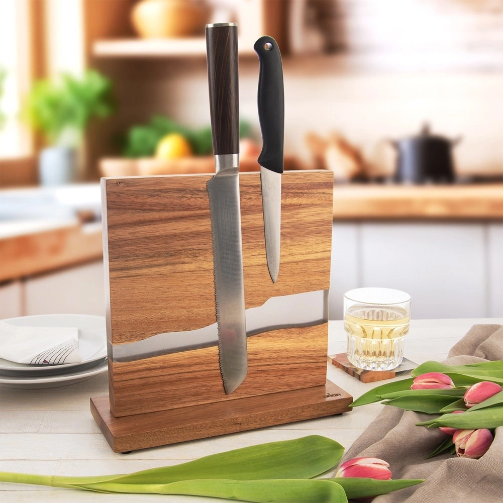 Élégant support de couteaux double face en bois d’acacia naturel avec résine décorative style « rivière », offrant une surface magnétique puissante, un rangement sûr et ordonné pour couteaux et ciseaux, et un design moderne adapté à toute cuisine. Grâce au rangement sur deux faces, il économise de la place sur le plan de travail et les patins en feutre sous la base protègent la surface des rayures.