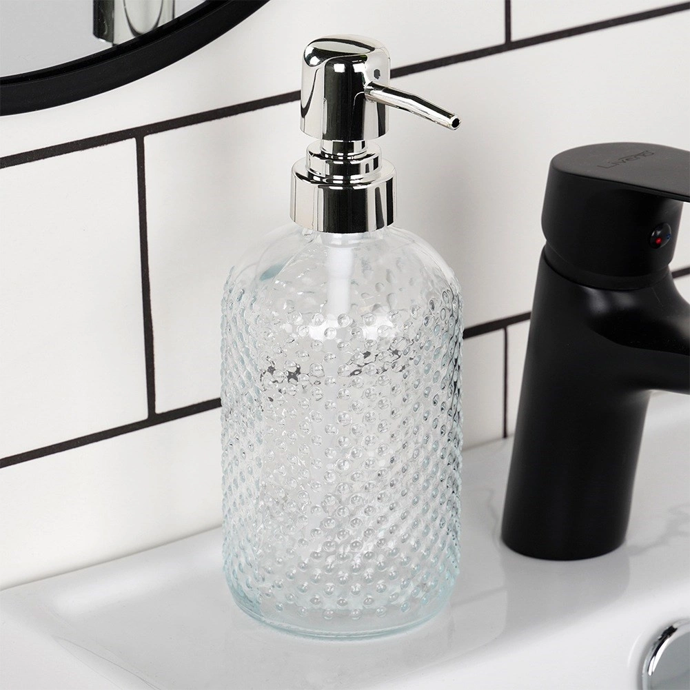 Ce distributeur stylé combine un verre transparent de qualité à la texture décorative pour une prise sûre, et une pompe robuste dans une élégante finition argentée. Avec sa capacité de 430 ml, il est idéal pour un usage quotidien dans la salle de bains comme dans la cuisine, et garde votre espace propre et organisé.