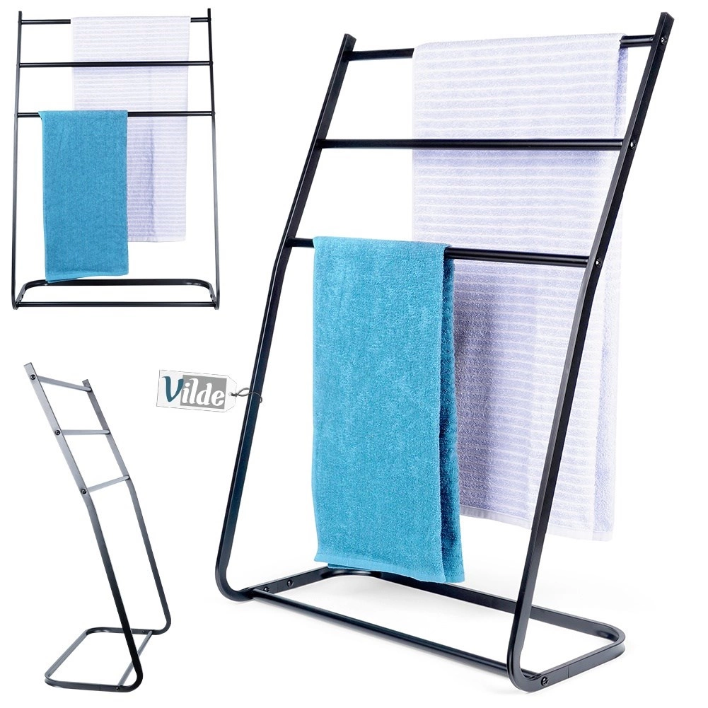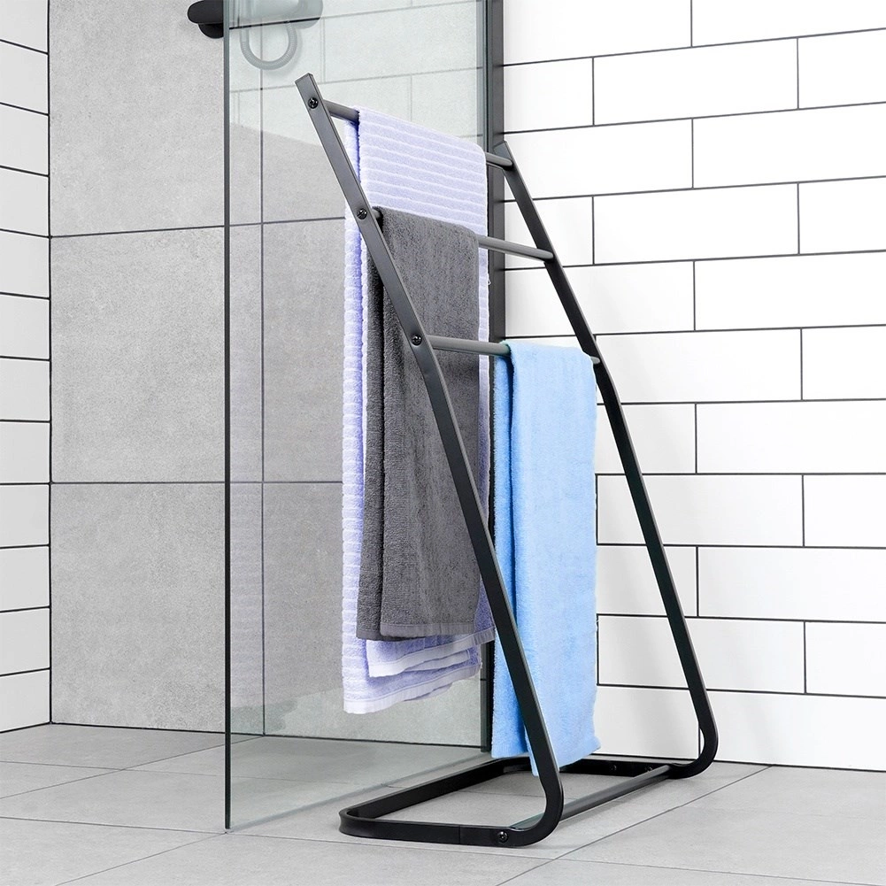 Ce porte-serviettes ou porte-vêtements autoportant en métal propose trois barres solides à différents niveaux pour une circulation d’air optimale et un séchage plus rapide. Son design minimaliste noir est épuré et intemporel, convenant aux salles de bain de style moderne comme classique.