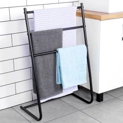 Pratique, ce porte-serviettes ou porte-vêtements autoportant à trois barres garde votre salle de bain ordonnée et élégante. Acier robuste avec revêtement par poudre pour une longue durabilité et une bonne stabilité, tandis que ses dimensions compactes s’intègrent parfaitement même dans les petits espaces.