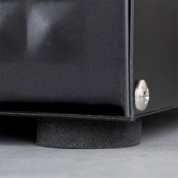 Le métal noir thermolaqué avec façade texturée et poignée en bois allie résistance et élégance. Des patins antidérapants protègent le plan de travail.