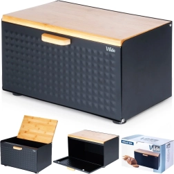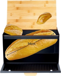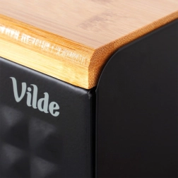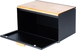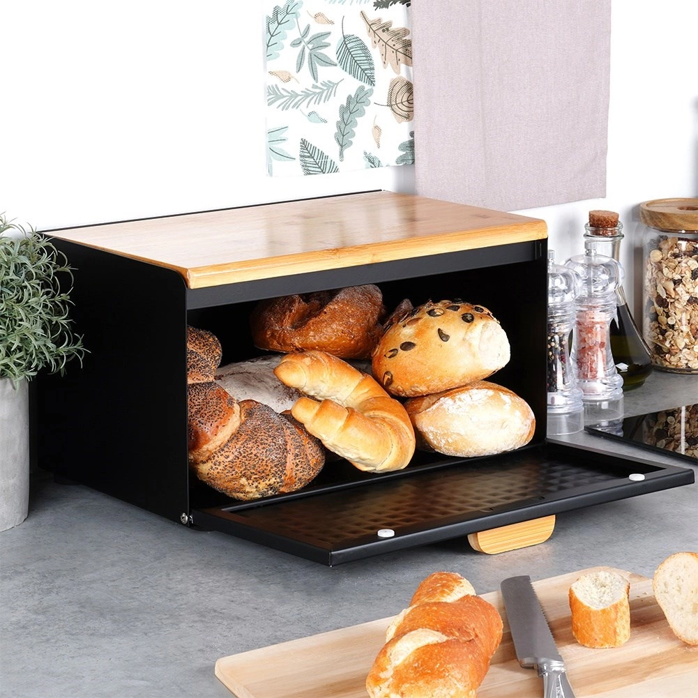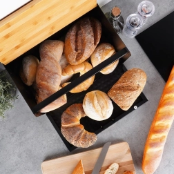 La surface texturée et la combinaison du noir et du bois soulignent son élégance. Le plateau supérieur peut servir de planche à découper – tout est à portée de main. La boîte est suffisamment spacieuse pour le pain, les petits pains, les baguettes et les pâtisseries, et grâce aux patins en feutre, elle n’abîme pas le plan de travail.