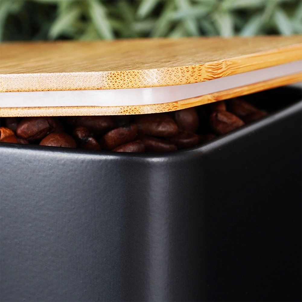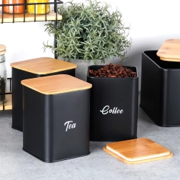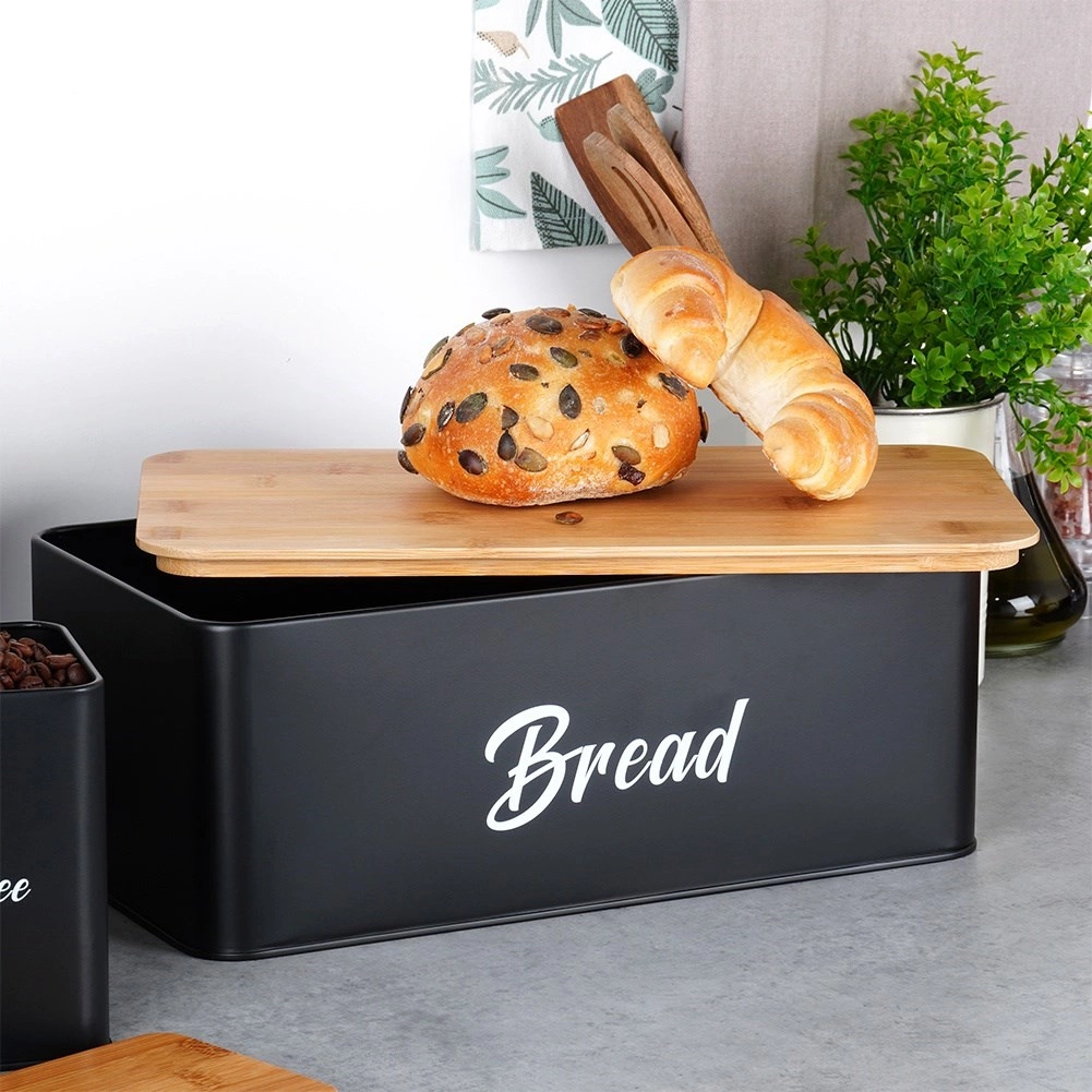 La boîte à pain en métal durable, peinte par poudrage, se distingue par des lignes épurées et un couvercle pratique en bois de bambou pouvant servir de planche à découper. La structure métallique protège la boulangerie du froissement et limite le dessèchement. Trois boîtes assorties avec couvercles en bambou conservent le sucre, le café et le thé plus aromatiques et bien organisés.