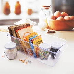 Fabriquée en plastique de qualité, résistant et sûr pour le contact alimentaire. Bords lisses, entretien facile et utilisation polyvalente non seulement dans le réfrigérateur, mais aussi dans le garde-manger, sur les étagères ou dans le dressing et le bureau.