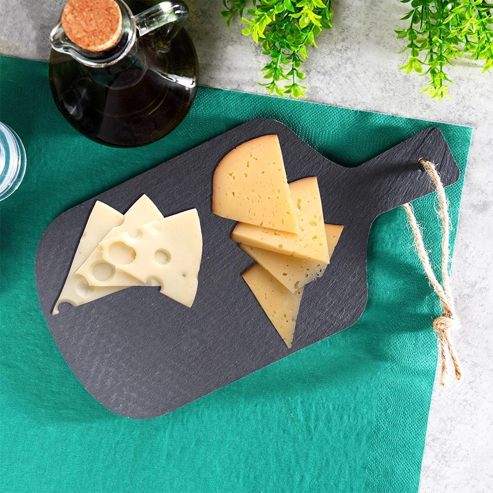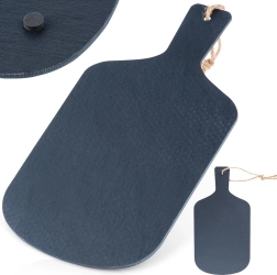 Planche de service en ardoise naturelle de 28,5 × 15 cm qui apporte une touche moderne et marquée à votre table. Grâce à ses bords travaillés et à sa surface naturellement texturée, elle est idéale pour servir fromages, charcuteries, tapas, desserts ou mini-pâtisseries. La poignée intégrée avec boucle facilite la manipulation et permet une suspension élégante.