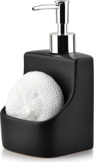 Élégant distributeur en céramique pour liquide vaisselle avec porte-éponge intégré, pour une cuisine propre et organisée. Il a une contenance de 400 ml, une finition noire mate moderne et un remplissage facile en dévissant la pompe. Inclus également : une éponge vaisselle et une poche frontale pratique pour un accès rapide.