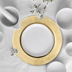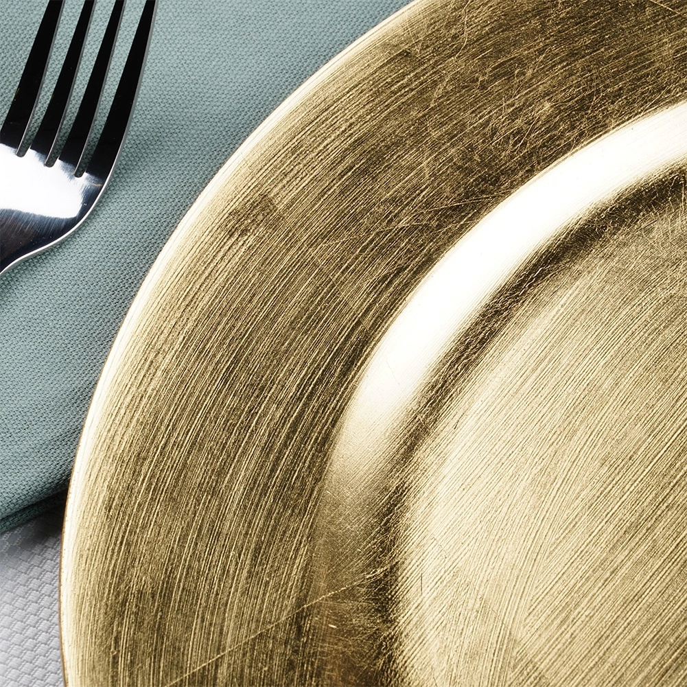 Ce dessous décoratif au fini doré moderne est idéal comme assiette de présentation ou comme base pour des compositions décoratives avec bougies ou fleurs. Sa forme ronde classique avec large bord met en valeur le service de table et protège la nappe de la chaleur et des impuretés.