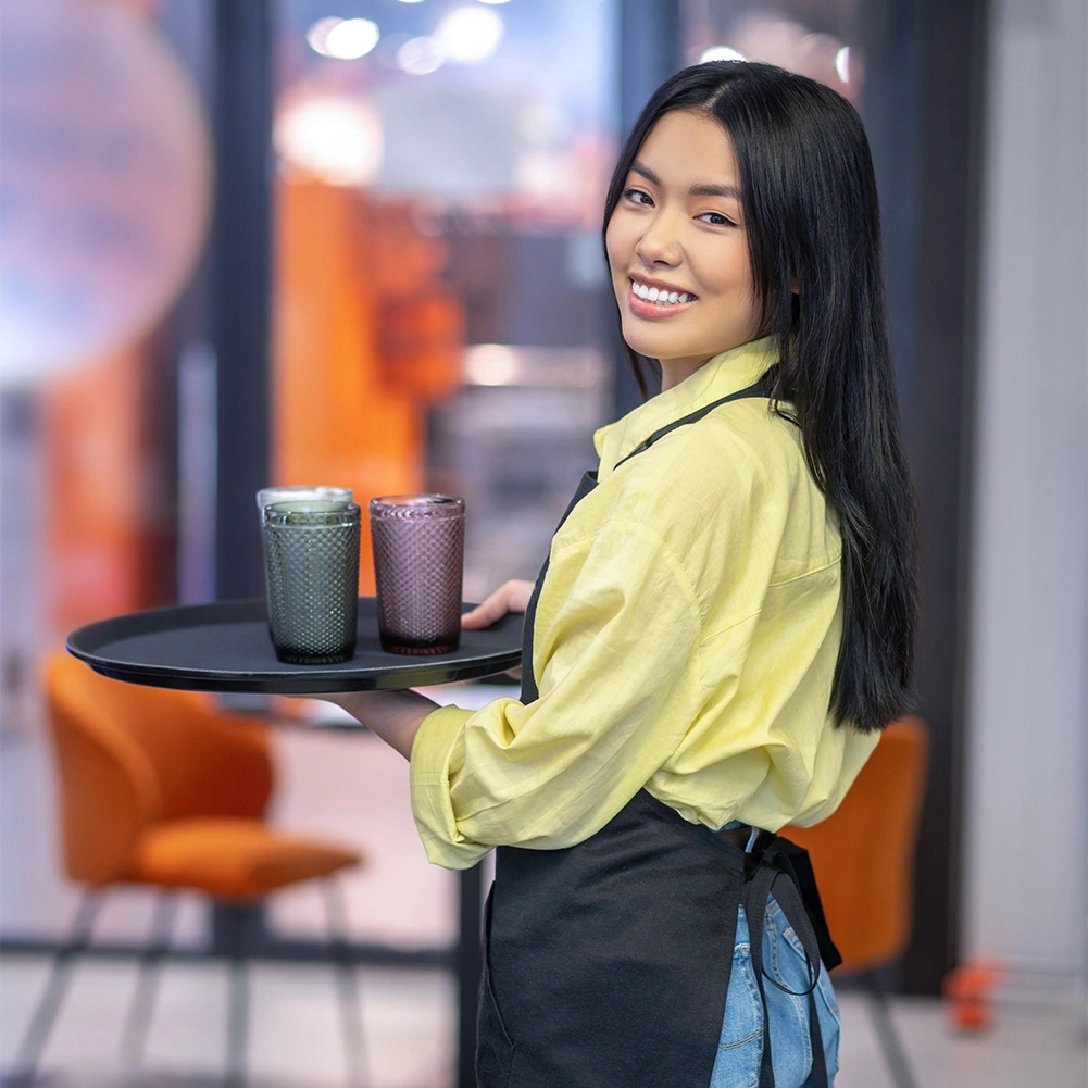 La surface texturée maintient verres et assiettes stables, même lorsque le service est en mouvement. Idéal pour les cafés et restaurants animés.