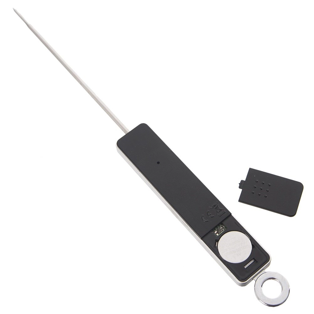 La conception robuste combine acier inoxydable et corps en plastique résistant de couleur noire. Le capuchon de protection de la sonde facilite un rangement sûr et les voyages, et l’œillet permet la suspension en cuisine. Alimentation par 1× pile CR2032 (non fournie).