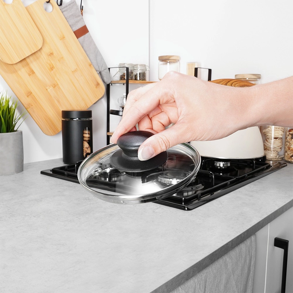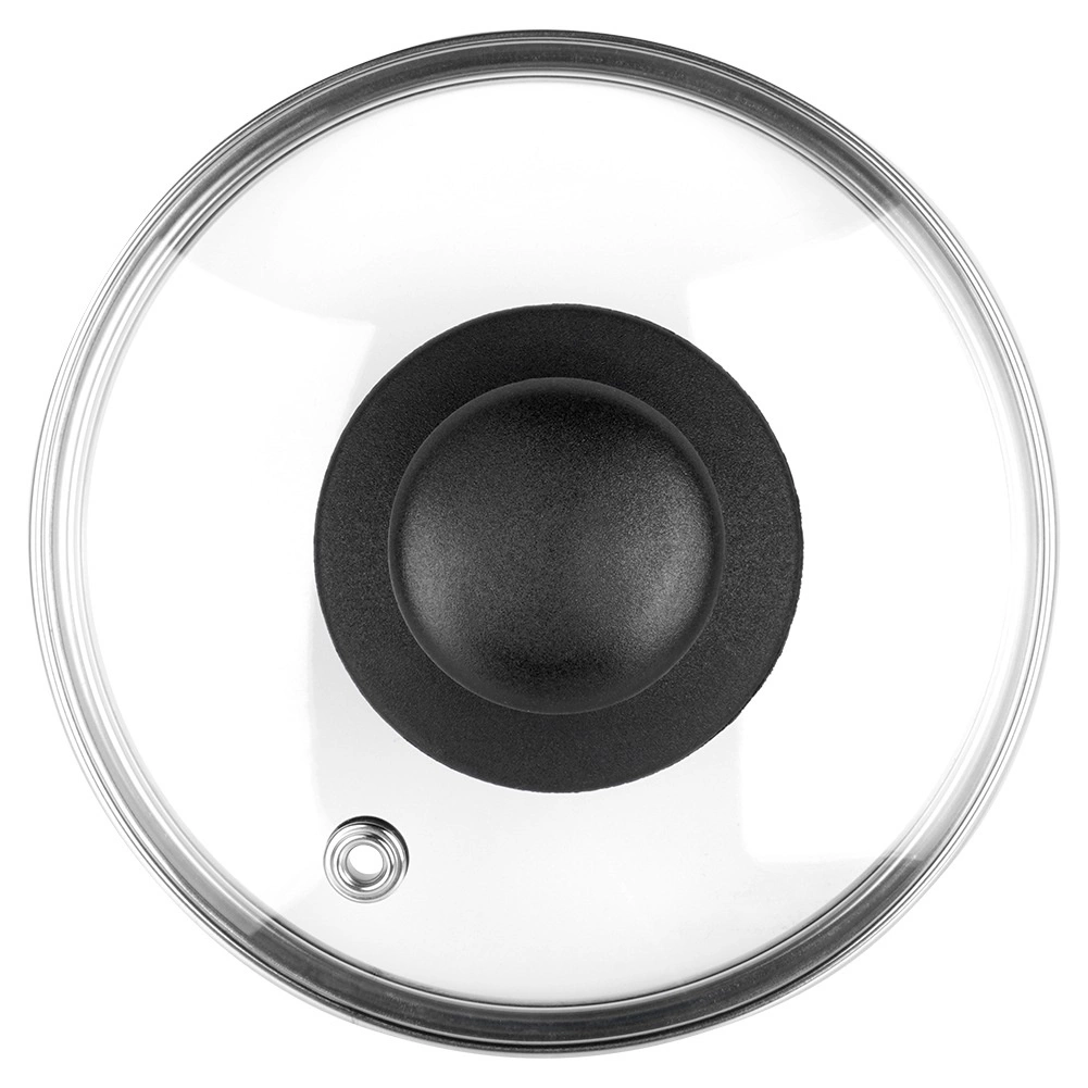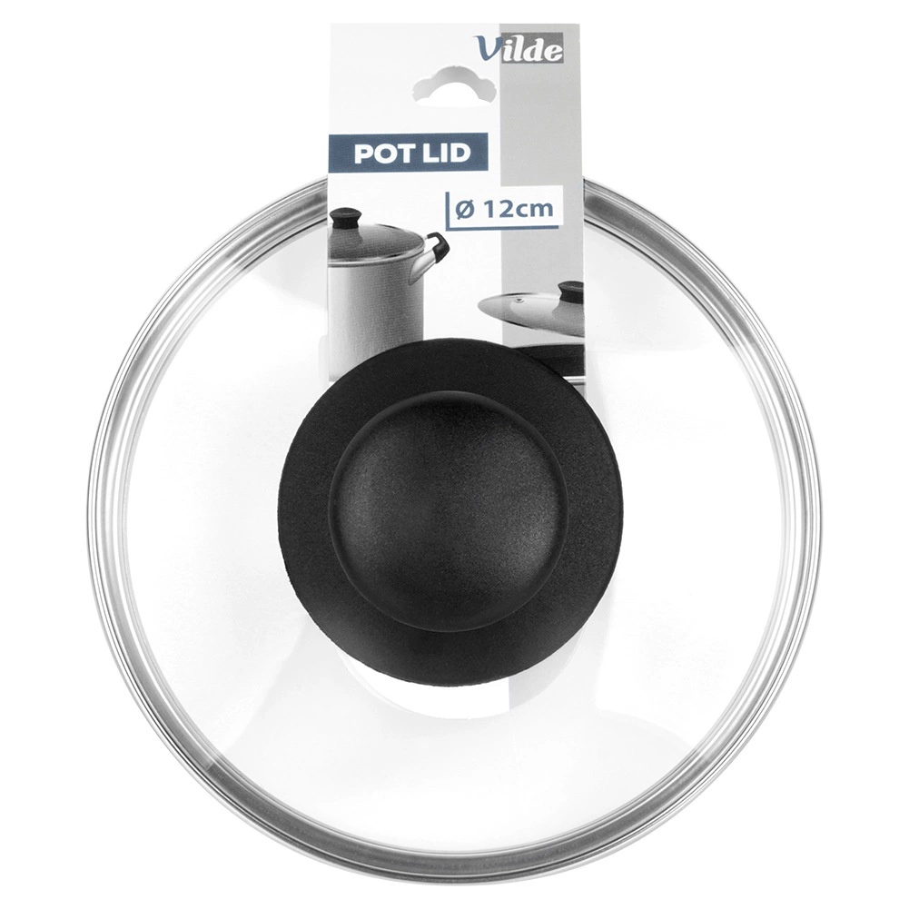 Couvercle universel en verre de 12 cm de diamètre avec bord en acier inoxydable et poignée confortable en plastique résistant. Grâce au verre transparent, vous pouvez contrôler la cuisson sans soulever le couvercle, l’orifice d’aération évacue l’excès de vapeur et le rebord haut assure une pose étanche. Le couvercle est résistant à la chaleur jusqu’à 200 °C et compatible lave-vaisselle.