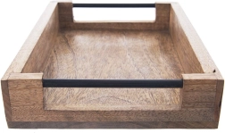 Élégant plateau de service en bois de manguier qui combine look naturel et style industriel loft. Grâce à ses bords hauts et à ses poignées métalliques solides noires, transporter tasses, théières, verres ou petites assiettes est simple et sûr. Le veinage naturel du bois apporte un caractère unique à votre table.