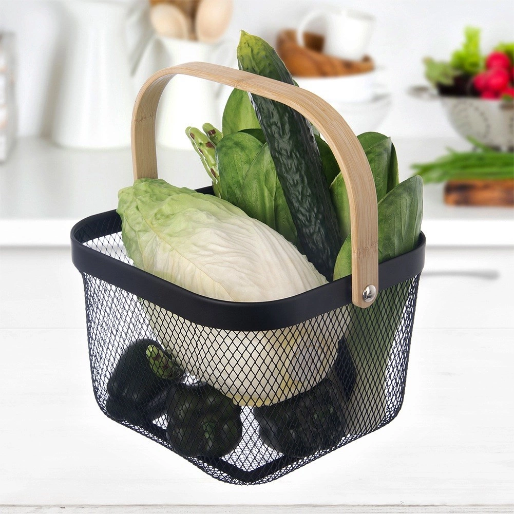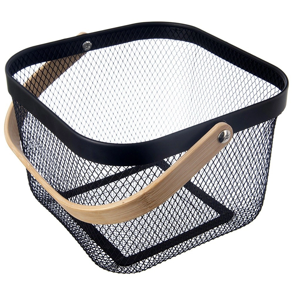 Panier de rangement stylé avec structure ajourée en métal et poignée en bambou confortable, idéal pour la cuisine, la salle de bain et le salon. Il offre une excellente circulation de l’air, une structure métallique stable et une utilisation polyvalente pour les fruits, les légumes, les cosmétiques ou les textiles. Son élégant coloris noir apporte une touche moderne à votre intérieur.