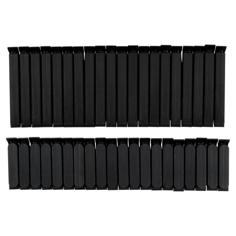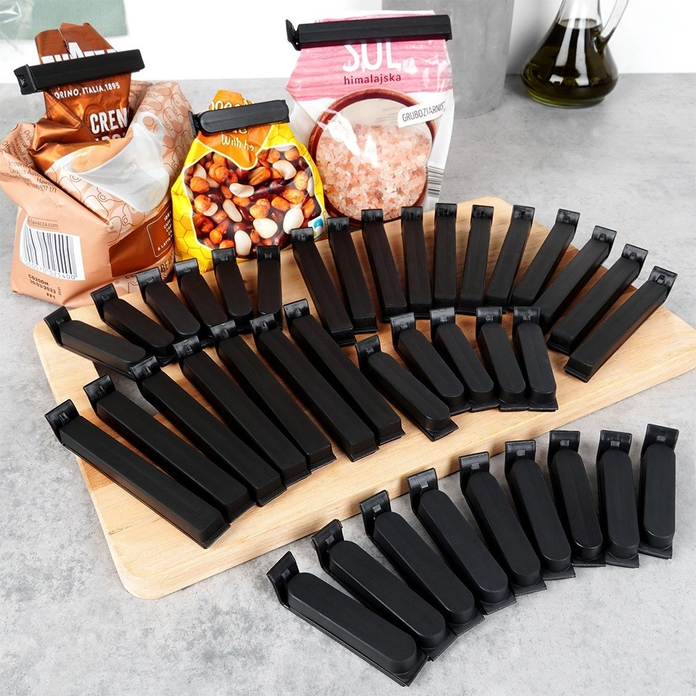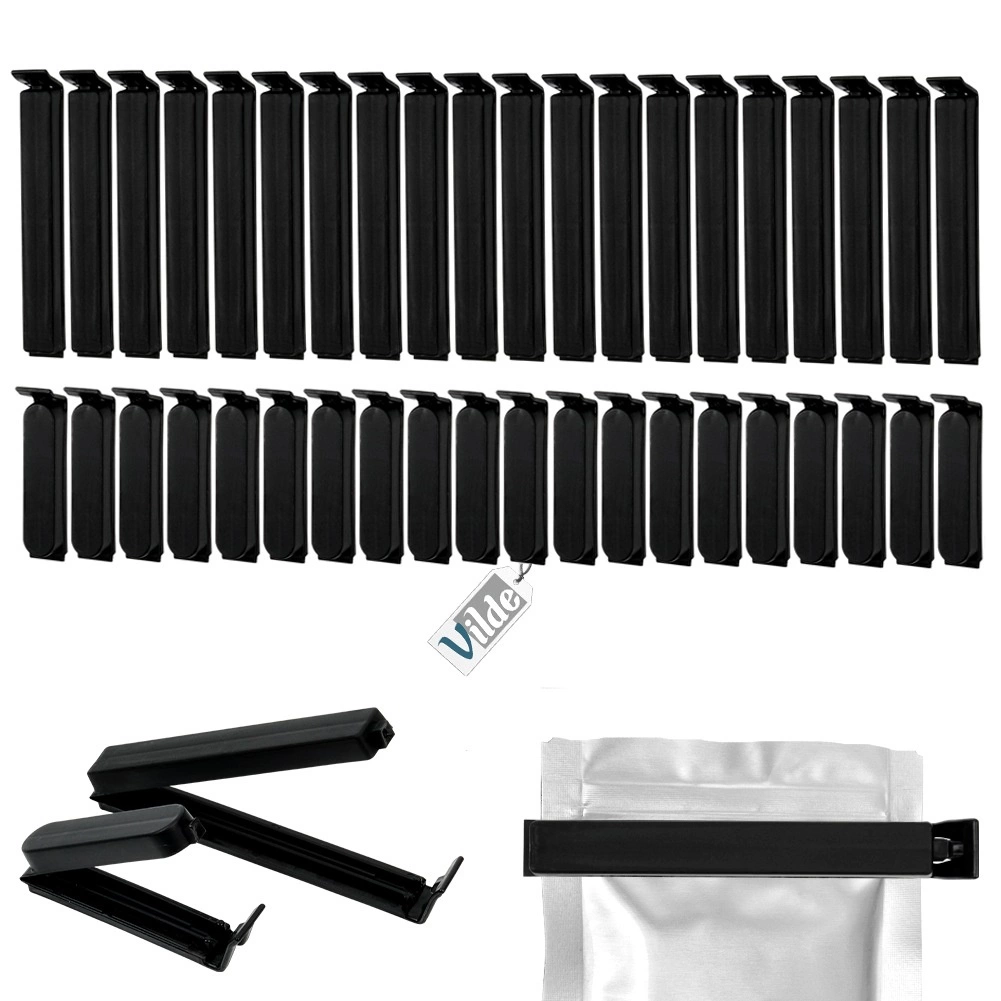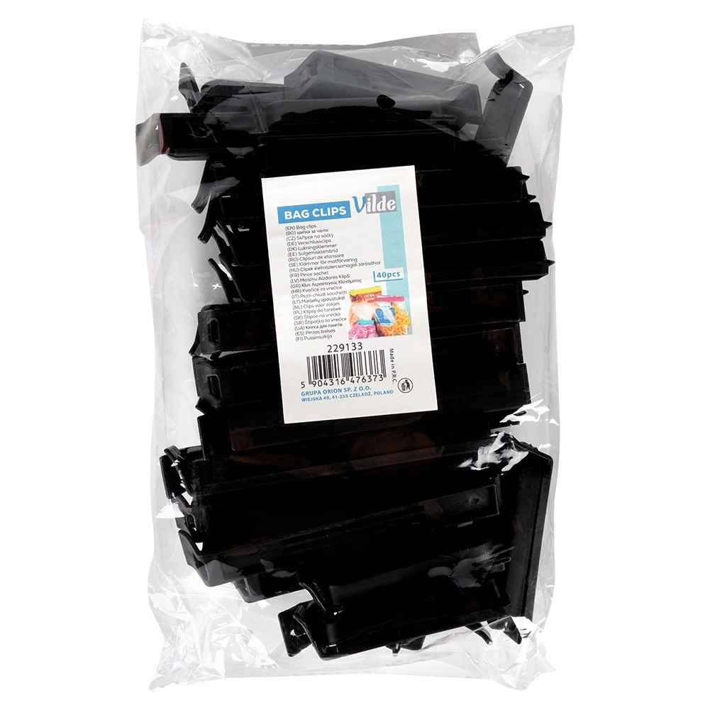 Pratique lot de 40 clips pour sacs en deux tailles pour garder les aliments frais plus longtemps et les protéger de l’humidité et de l’air. Clips en plastique résistants de couleur noire, faciles à utiliser, à fermeture serrée, adaptés pour café, épices, surgelés, pâtes et légumineuses. Produit original Vilde.
