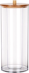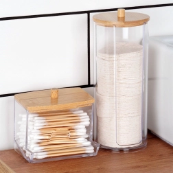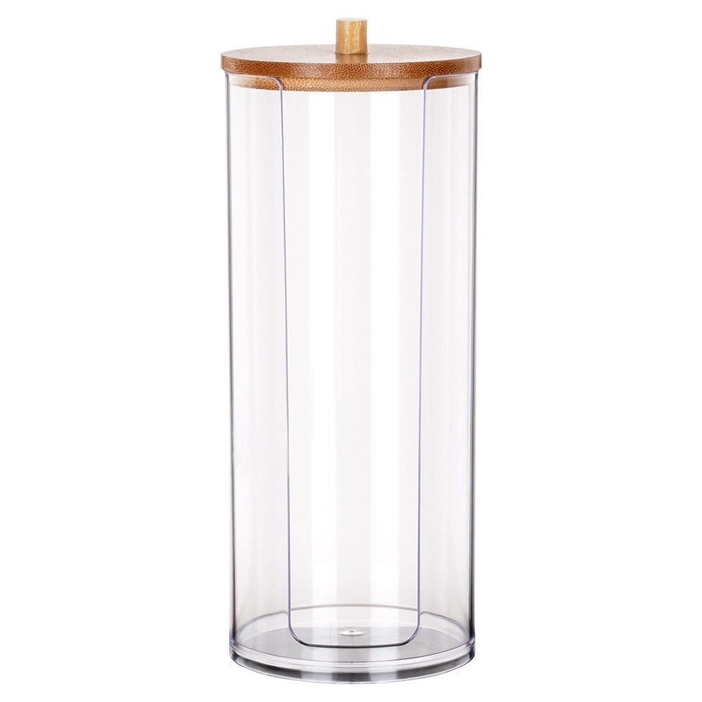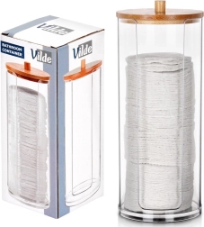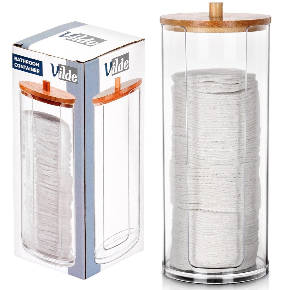 Élégant distributeur de cotons démaquillants en acrylique transparent avec couvercle en bambou pour garder vos cotons propres et à l’abri de la poussière. Grâce à son découpe pratique, ils sont toujours à portée de main, le corps transparent indique le niveau restant et ses dimensions compactes 7 × 18 cm conviennent à toute salle de bain.