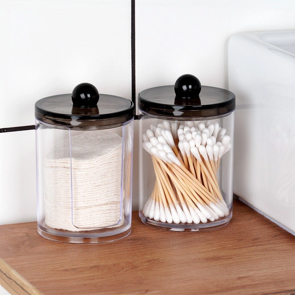 Organiseur de salle de bain pratique et élégant : distributeur acrylique transparent avec couvercle noir pour garder vos cotons-tiges ou disques démaquillants toujours à portée de main et protégés de la poussière. Grâce à ses dimensions compactes (diamètre 7 cm, hauteur 11 cm), il économise de l’espace tout en offrant une capacité suffisante pour un usage quotidien. Design transparent pour vérifier rapidement le contenu, couvercle avec poignée pratique pour une ouverture facile et large ouverture pour un remplissage rapide.