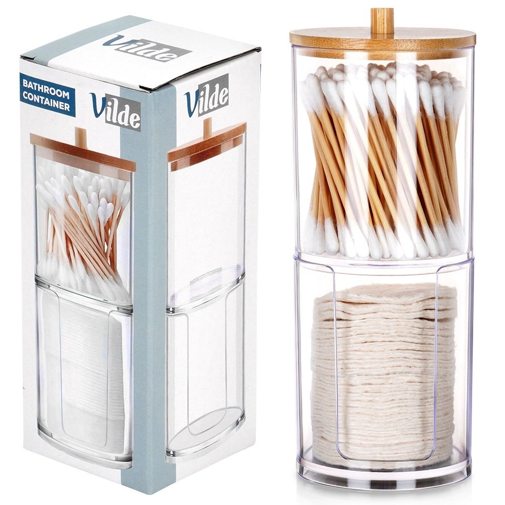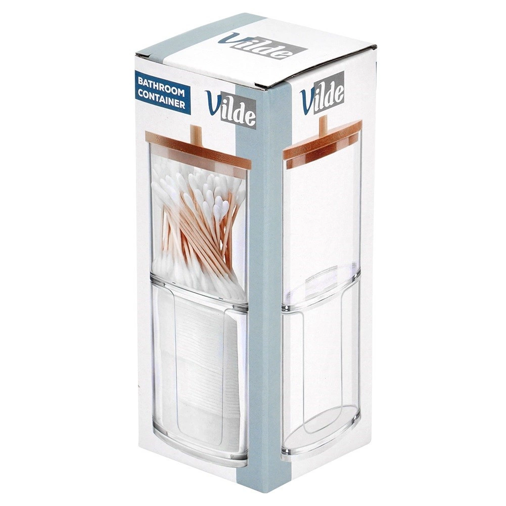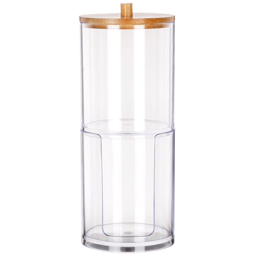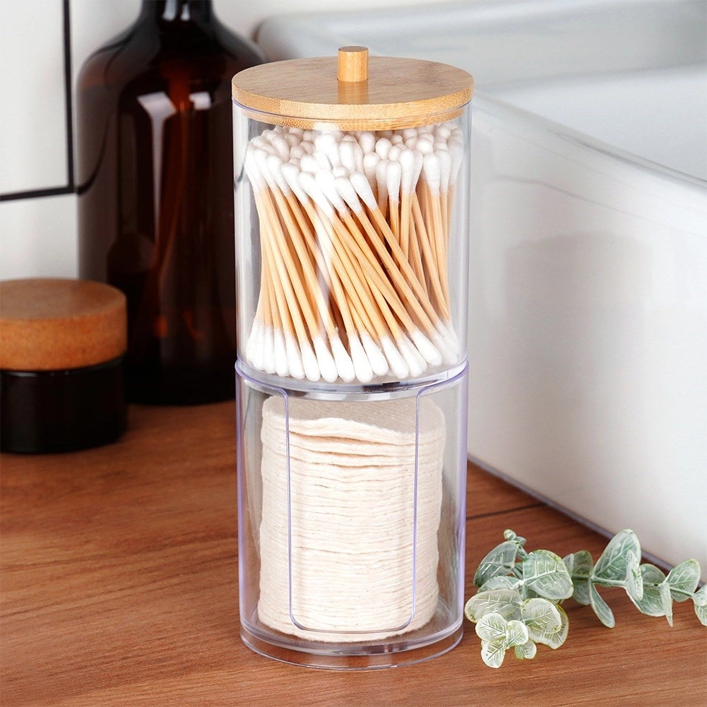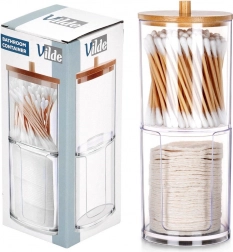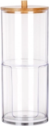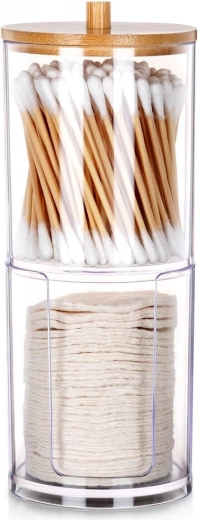 Un accessoire élégant et fonctionnel pour toute salle de bain. Deux compartiments séparés en acrylique transparent assurent un rangement hygiénique et clair des cotons-tiges et des disques ronds. La partie supérieure est couverte d’un couvercle en bambou avec poignée, la section inférieure dispose d’un découpe frontale pour une distribution facile.