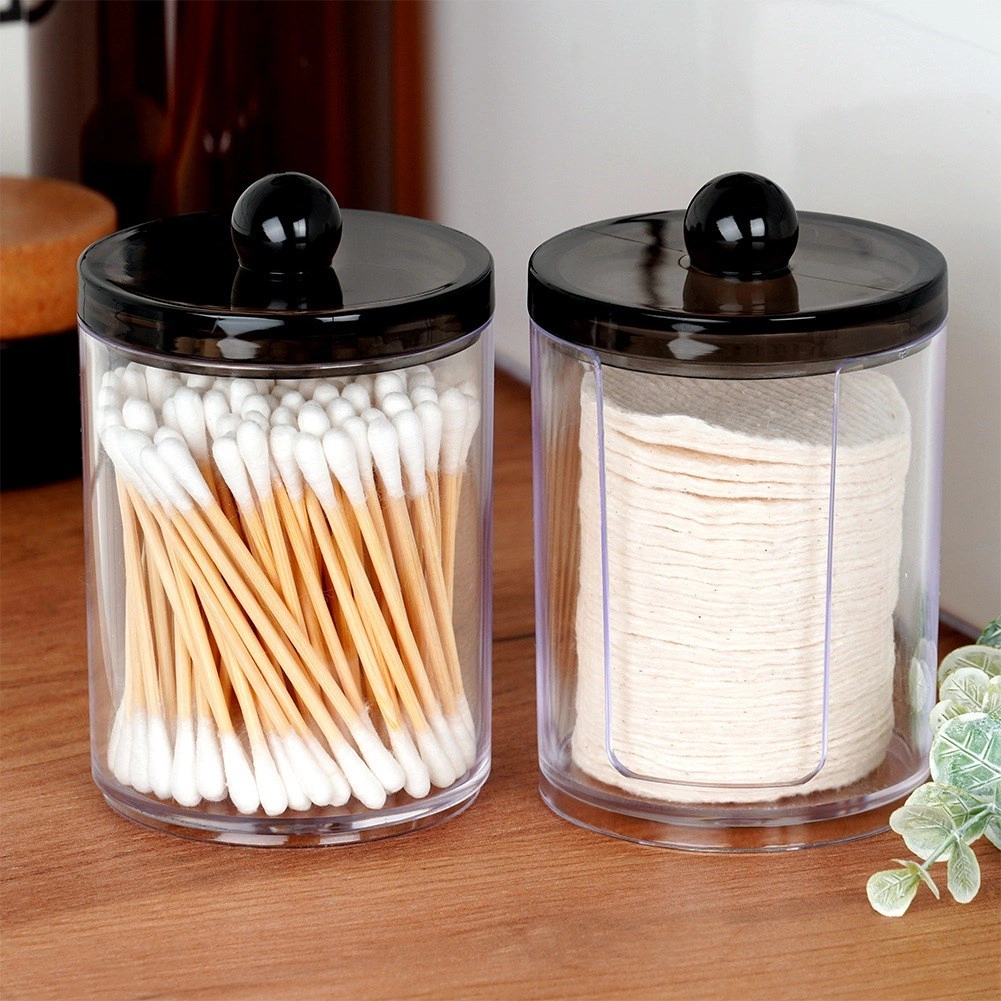 Ensemble pratique de deux boîtes transparentes en acrylique pour cotons-tiges et disques démaquillants. Dimensions compactes, couvercle hygiénique avec prise contre la poussière et distributeur de disques astucieux pour un accès rapide. Le design minimaliste et moderne convient à toute salle de bain.