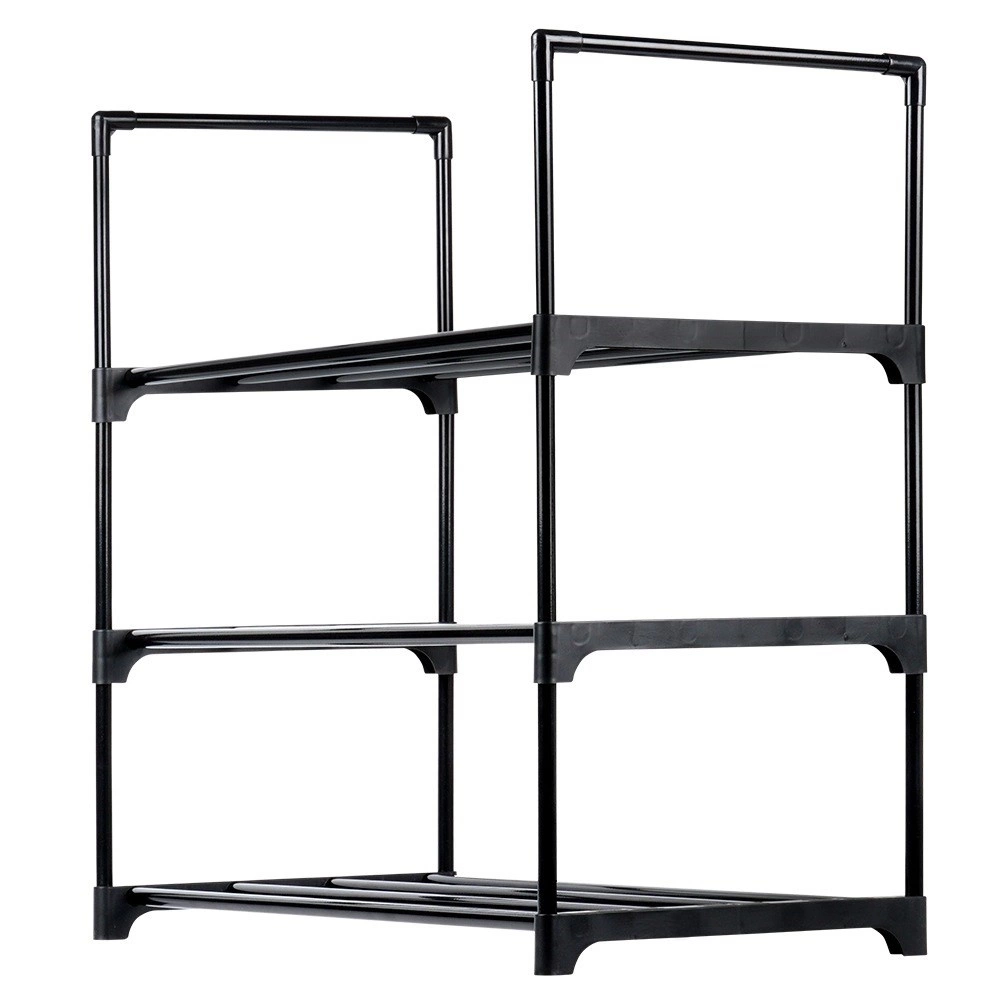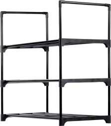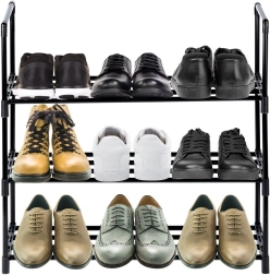 Meuble à chaussures pratique à 3 niveaux en métal résistant, finition noire mate, pour ranger clairement jusqu’à 9 à 12 paires. Grâce à ses dimensions compactes de 57 × 28 × 55 cm, il économise de la place et assure une meilleure organisation dans l’entrée ou le dressing. Structure stable avec tubes métalliques et grilles ouvertes pour la ventilation afin de garder les chaussures sèches et visibles.