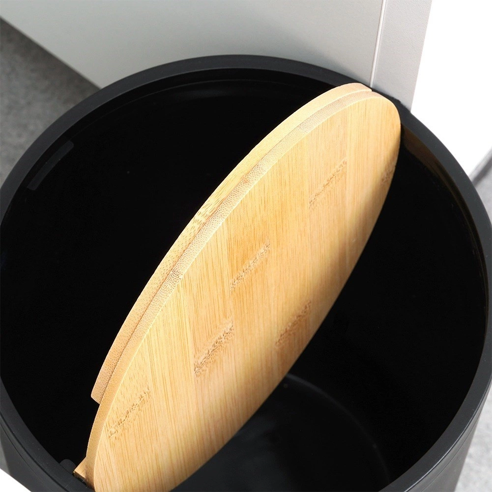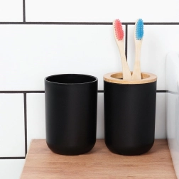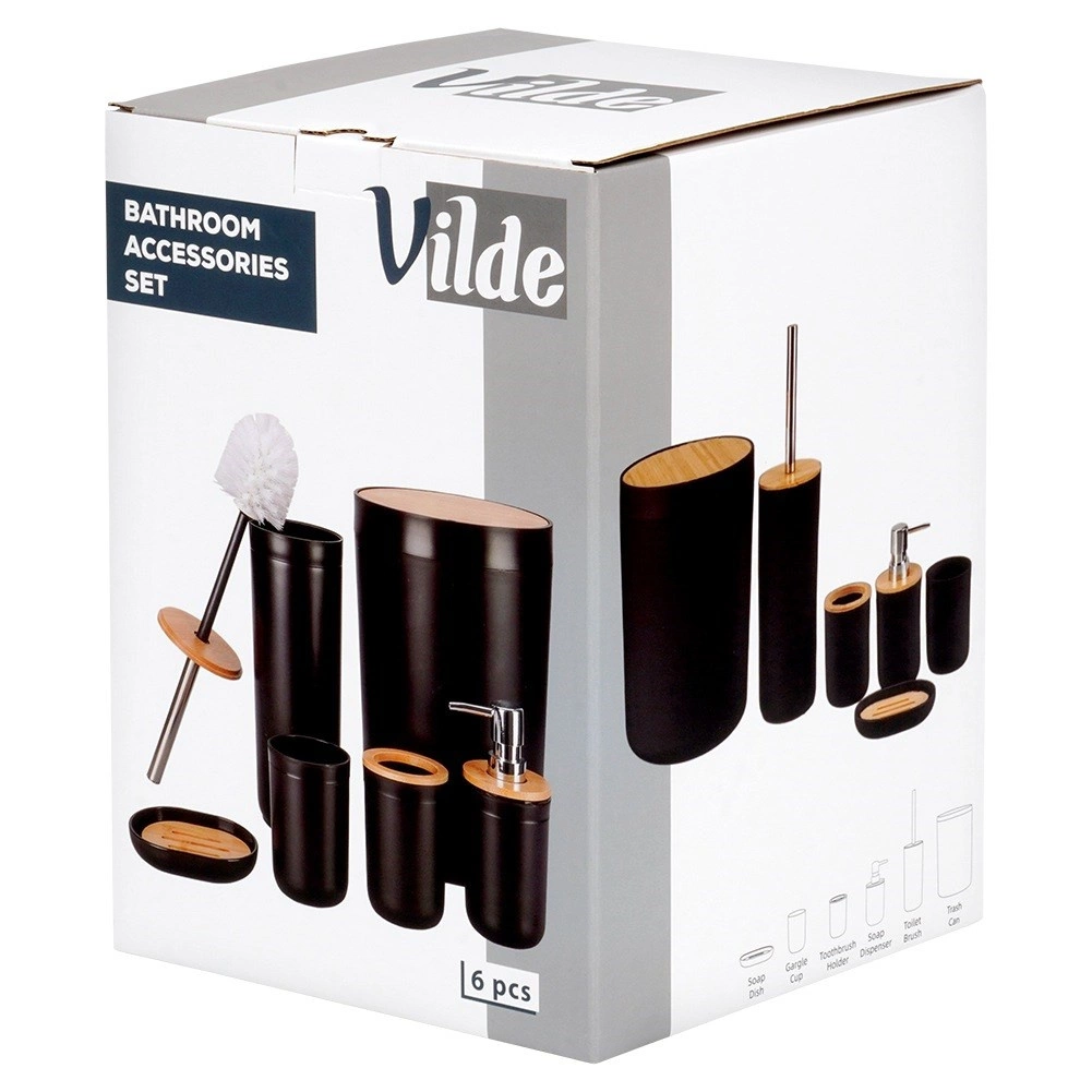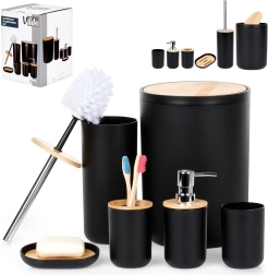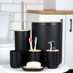 Élégant ensemble de salle de bain en noir mat avec accents de bambou offrant une organisation complète de la salle de bain dans un style uniforme. Comprend un distributeur de savon, un porte-savon, un verre pour brosses à dents, un autre gobelet, une brosse WC avec support fermé et une poubelle à couvercle basculant. Matériaux résistants, entretien facile et design moderne et minimaliste conviennent à toute salle de bain.