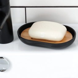Un set coordonné en noir mat avec bambou unifie l’aspect de la salle de bain et garde les indispensables bien ordonnés et à portée de main.