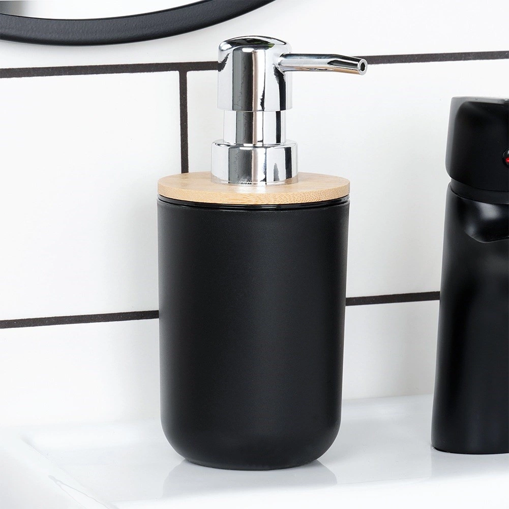 - Plastique (noir mat), accessoires en bambou, éléments métalliques (pompe/tringlerie)