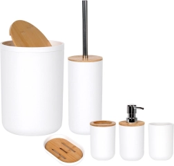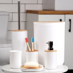 Le set unifie l’apparence de la salle de bains et fournit tout le nécessaire : distributeur, porte-savon, porte-brosses à dents, gobelet, brosse WC et poubelle. Le design minimaliste blanc avec bambou dégage chaleur et pureté.