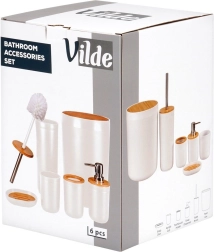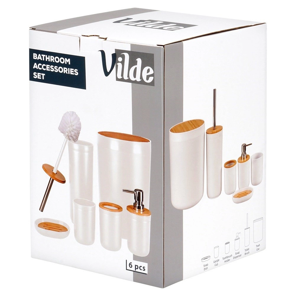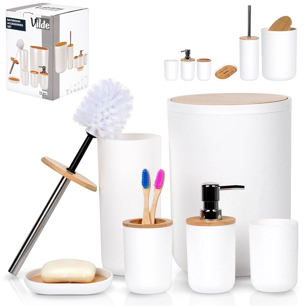 Élégant ensemble de salle de bains blanc avec accents de bambou, apportant ordre et style à toute salle de bains. Il comprend 6 accessoires pratiques : un distributeur de savon, un porte-savon, un porte-brosses à dents, un gobelet, une brosse WC avec support et une poubelle. Matériaux résistants, entretien facile et design moderne et minimaliste s’harmonisant avec tout intérieur.