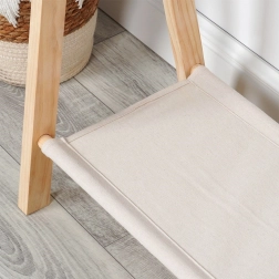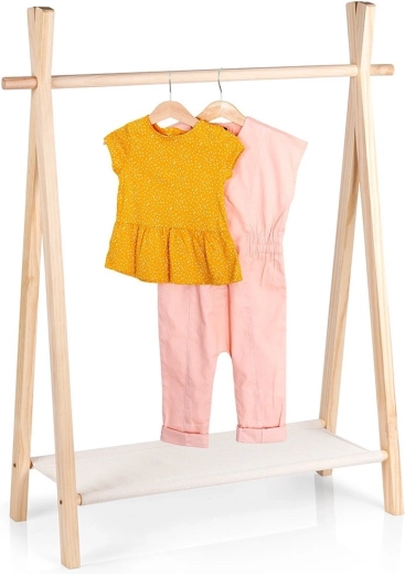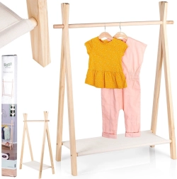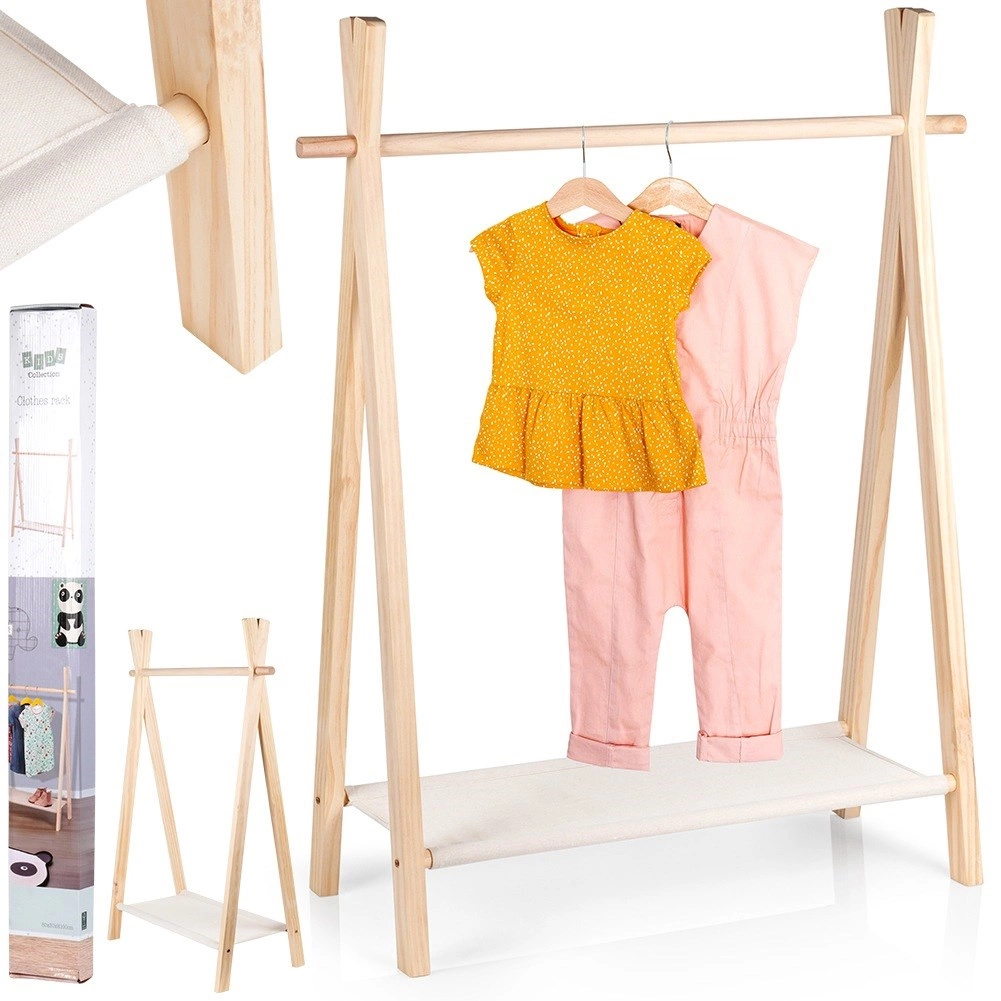 Ce portant minimaliste pour enfants en pin avec étagère en toile de lin couleur naturelle apporte ordre et style à la chambre d’enfant. Cadres en A stables, bois naturel et étagère inférieure pratique pour les chaussures et accessoires en font une solution fonctionnelle et esthétique pour un usage quotidien.