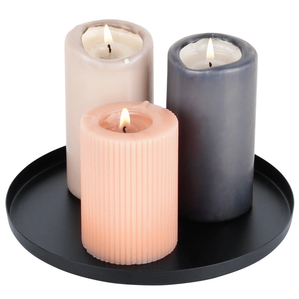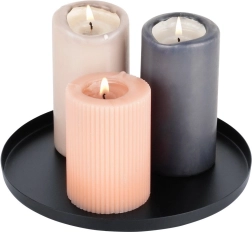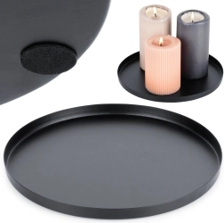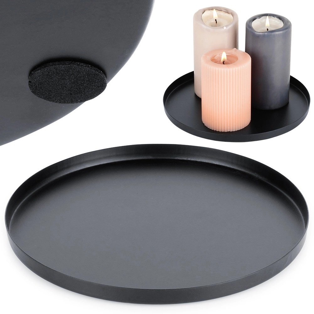 Élégant plateau en métal de couleur noir mat, idéal comme base pour décorations et bougies. Il a un diamètre de 21,5 cm, un bord bas pour retenir la cire et, sur la face inférieure, des patins de protection en feutre. Grâce à son design minimaliste, il met en valeur chaque composition avec élégance tout en protégeant les meubles des rayures et des taches.