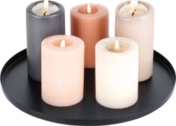 La face inférieure est équipée de patins en feutre qui empêchent le glissement et les rayures sur les plateaux de table, commodes ou étagères. Le plateau est robuste tout en restant visuellement léger — un excellent choix pour les compositions décoratives, bougeoirs et agencements saisonniers.