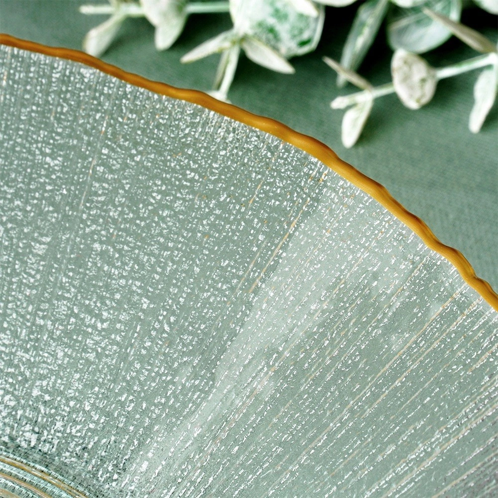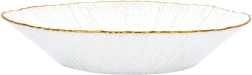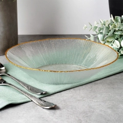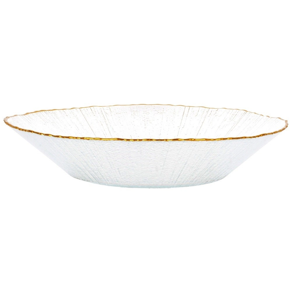 Élégant bol en verre avec un bord doré et une texture délicate, idéal pour servir des salades, des accompagnements et des desserts. Il a une capacité de 500 ml, des dimensions de 20,5 × 20,5 × 4 cm et, grâce au verre clair de haute qualité avec effet cristal, apporte à votre table une allure luxueuse. Pour une longue durée de vie, nous recommandons le lavage à la main.