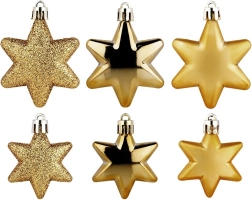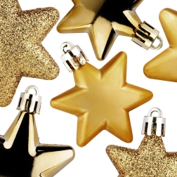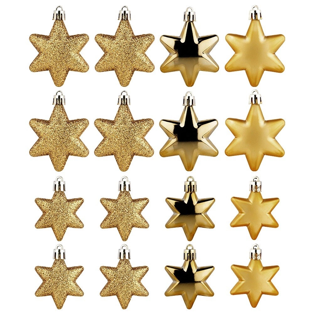 Élégant set de 16 décorations de Noël incassables en forme d’étoile, dans une luxueuse teinte dorée qui illumine chaque sapin. Contient un mélange de finitions – brillant, mat et paillettes – pour un effet parfaitement équilibré. Grâce au plastique résistant, elles sont sûres pour les foyers avec enfants et animaux de compagnie et se suspendent facilement à l’aide des cordelettes fournies.