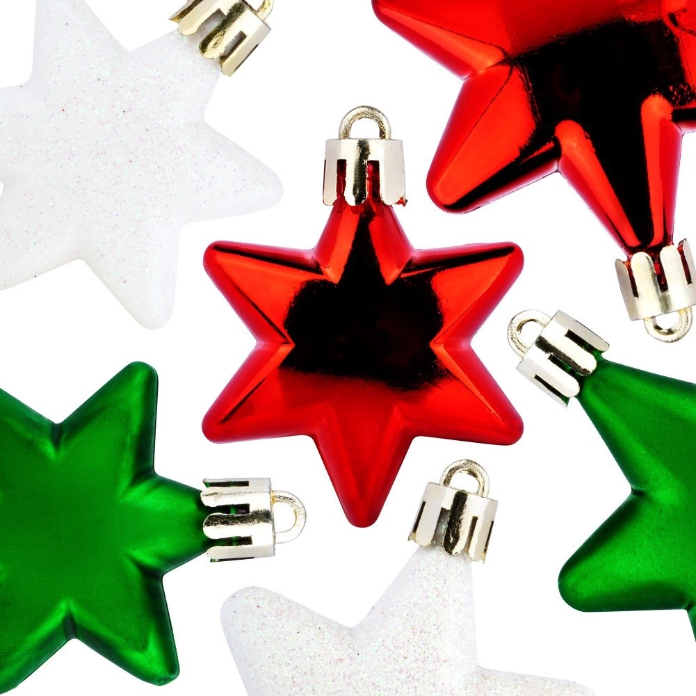Des étoiles brillantes, mates et pailletées en rouge, vert et blanc créent une composition harmonieuse et festive et confèrent au sapin un charme de Noël classique.