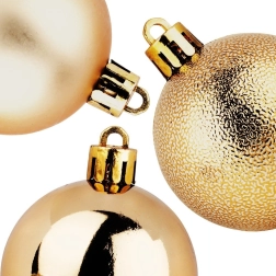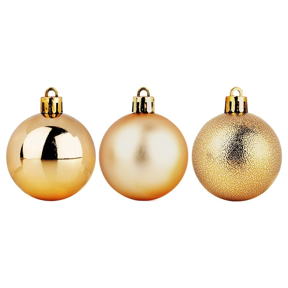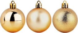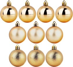 Élégant lot de 10 boules de Noël dorées d’un diamètre de 5 cm en finitions brillante, mate et texturée. Grâce au plastique incassable, elles sont sûres pour les enfants comme pour les animaux de compagnie et apportent à votre décoration un éclat festif classique. Des cordons de suspension sont inclus.