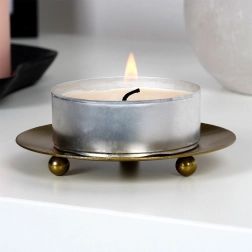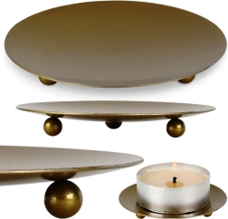 Élégant socle en métal pour bougies, diamètre 8,5 cm, finition doré mat. Grâce à ses trois pieds sphériques, il est stable, protège les surfaces de la chaleur et de la cire et offre aux bougies une présentation élégante. Son design minimaliste convient aux intérieurs modernes et peut aussi servir de coupe décorative pour petits objets ou bijoux.