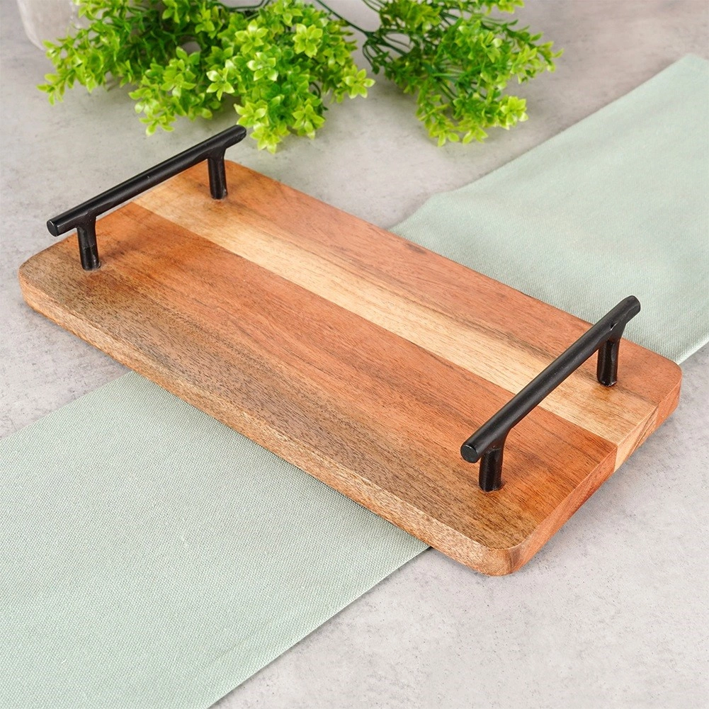 Plateau de service élégant en bois d’acacia avec deux poignées métalliques noires pour un transport confortable. Idéal pour un usage quotidien comme pour un service festif. Dimensions 30 × 15,5 × 5 cm, finition naturelle, construction robuste et utilisation polyvalente du petit-déjeuner aux desserts.