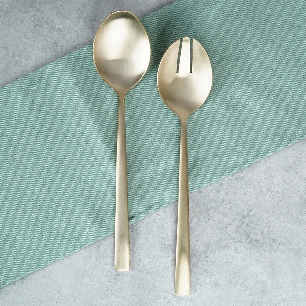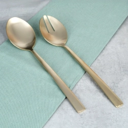 Le lot de 2 cuillères à salade au fini doré tendance apporte une touche d’élégance à votre table. La surface satinée brossée combine un éclat discret et un mat délicat pour un look moderne adapté à tout intérieur.