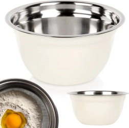 Ce bol pratique en acier inoxydable de qualité allie design intemporel et haute résistance. L’extérieur blanc apporte une touche élégante, tandis que l’intérieur poli facilite le nettoyage et garantit l’hygiène. Sa forme profonde et arrondie avec rebord élargi assure un mélange et un transvasement confortables.